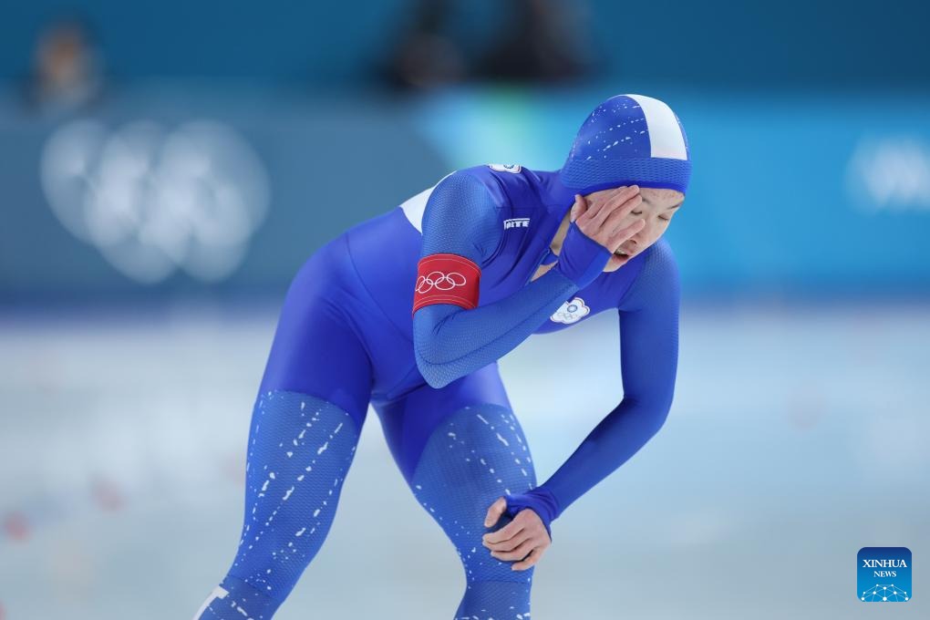 Chen Ying-chu of Chinese Taipei reacts after the speed skating women's 500m final match at the Milan-Cortina 2026 Olympic Winter Games in Milan, Italy, Feb. 15, 2026. (Xinhua/Li Jing)