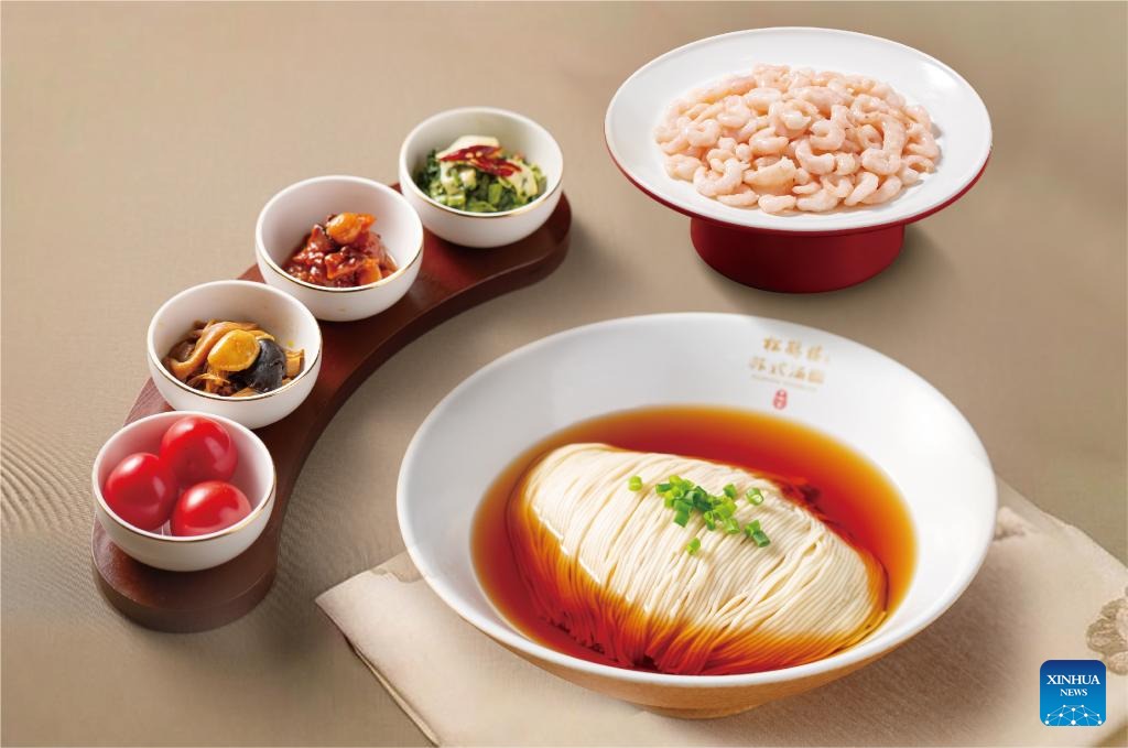 This photo taken on Feb. 13, 2026 shows a shrimp noodles set at a restaurant of Songhelou Suzhou Noodles in Shanghai, east China. (Xinhua)