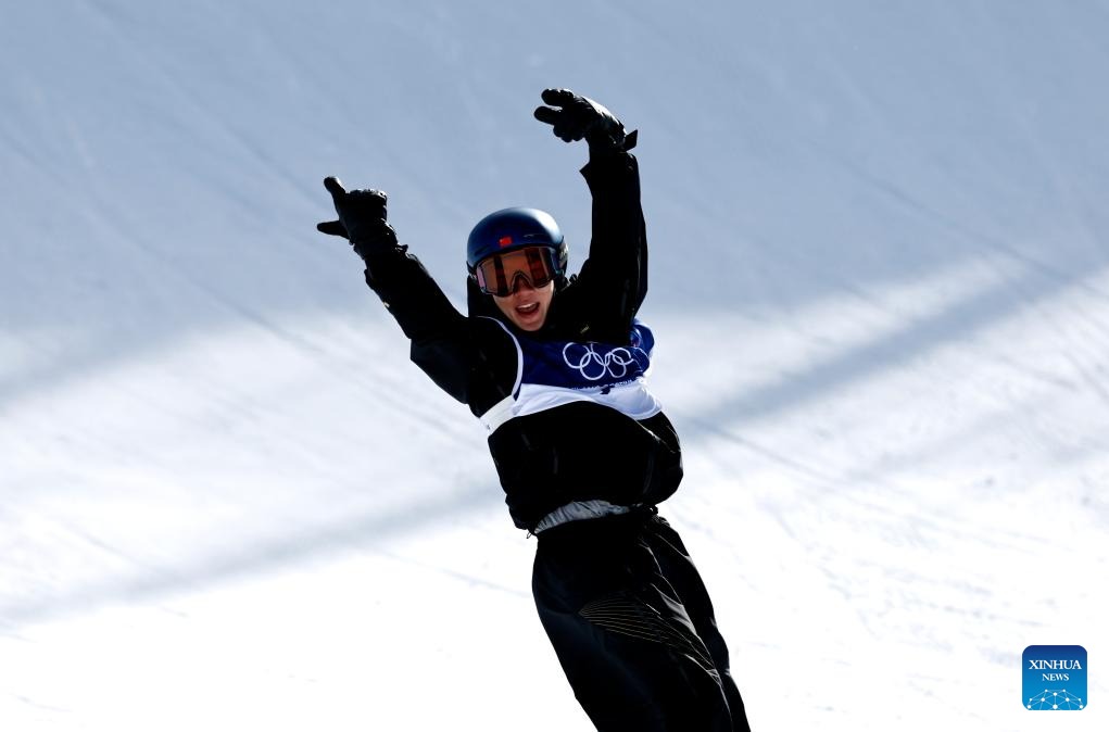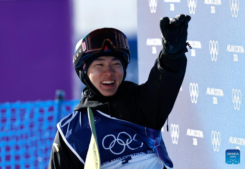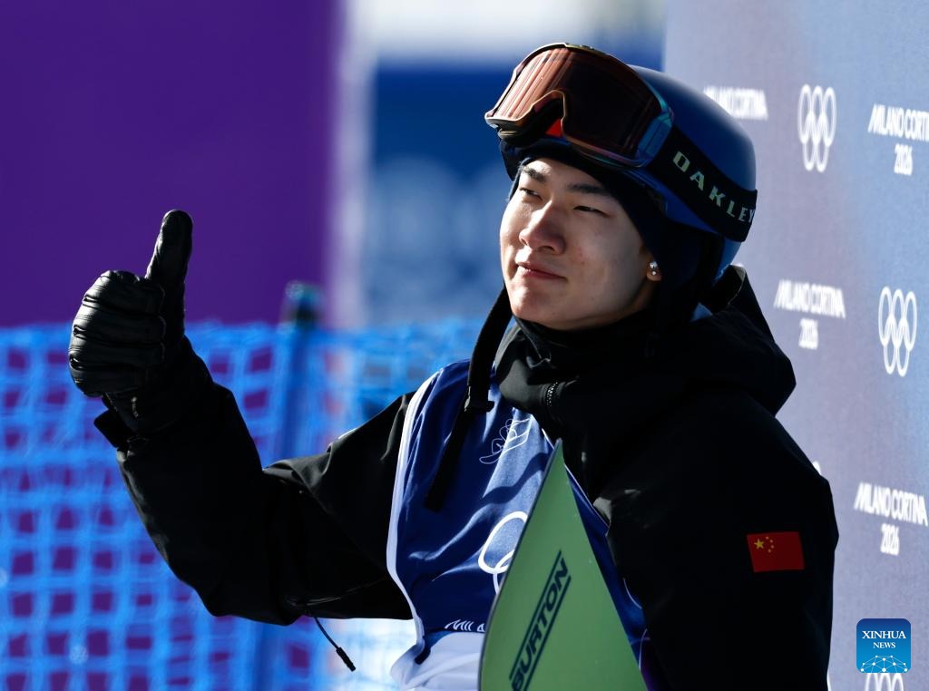 Su Yiming of China reacts during the snowboard men's snowboard slopestyle qualification at the Milan-Cortina 2026 Olympic Winter Games in Livigno, Italy, Feb. 15, 2026. (Xinhua/Wang Peng)