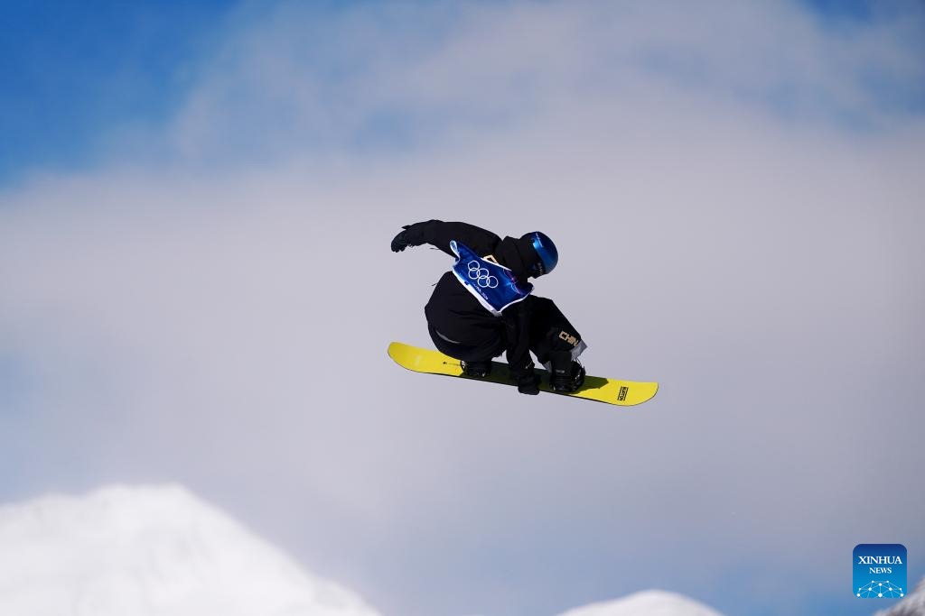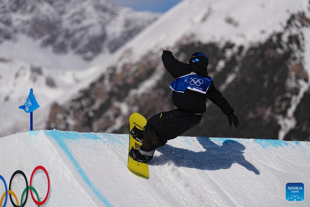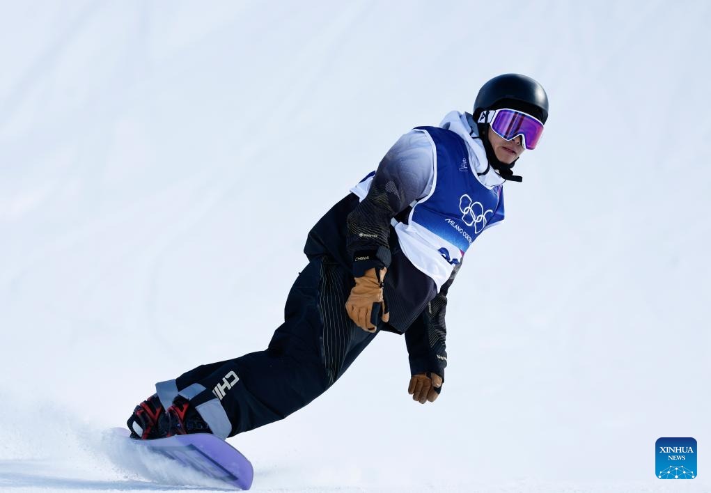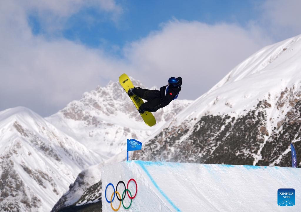 Ge Chunyu of China competes during the snowboard men's snowboard slopestyle qualification at the Milan-Cortina 2026 Olympic Winter Games in Livigno, Italy, Feb. 15, 2026. (Xinhua/Hu Chao)