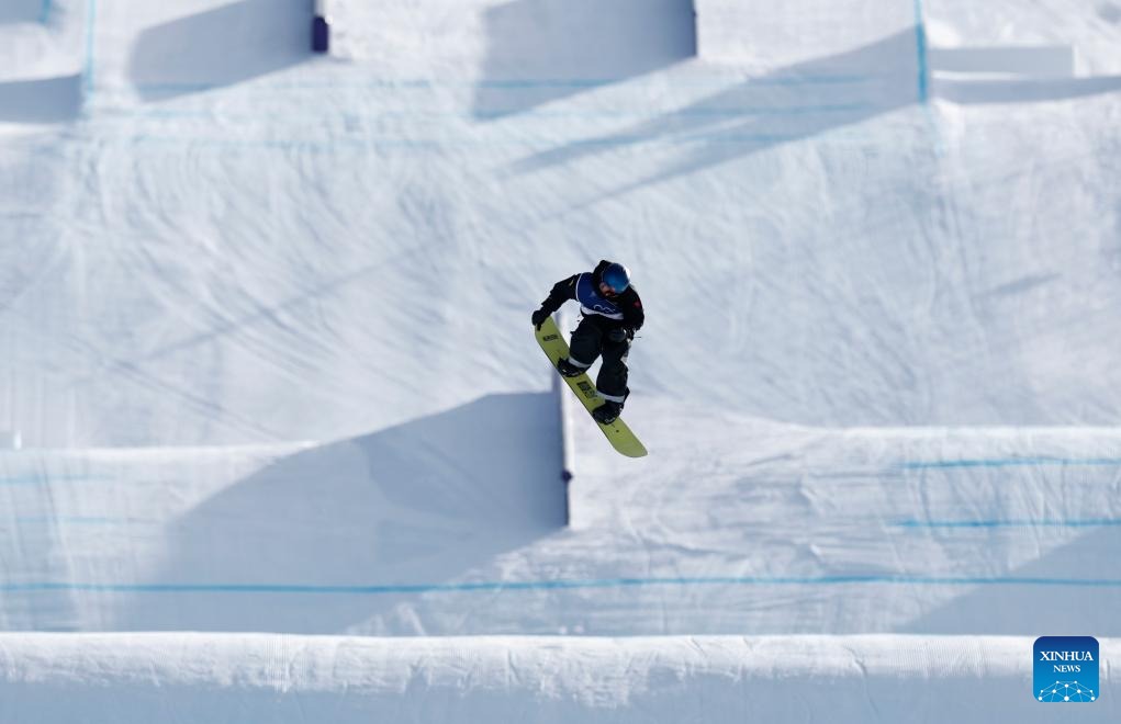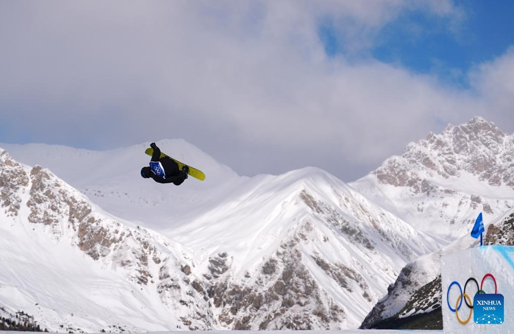 Su Yiming of China competes during the snowboard men's snowboard slopestyle qualification at the Milan-Cortina 2026 Olympic Winter Games in Livigno, Italy, Feb. 15, 2026. (Xinhua/Wang Peng)