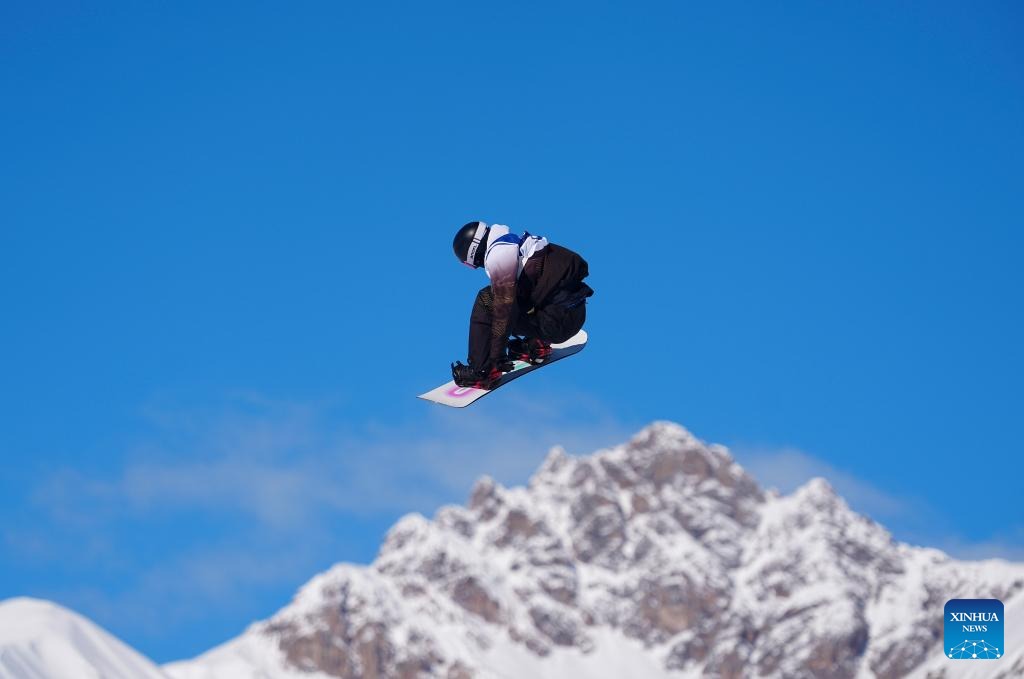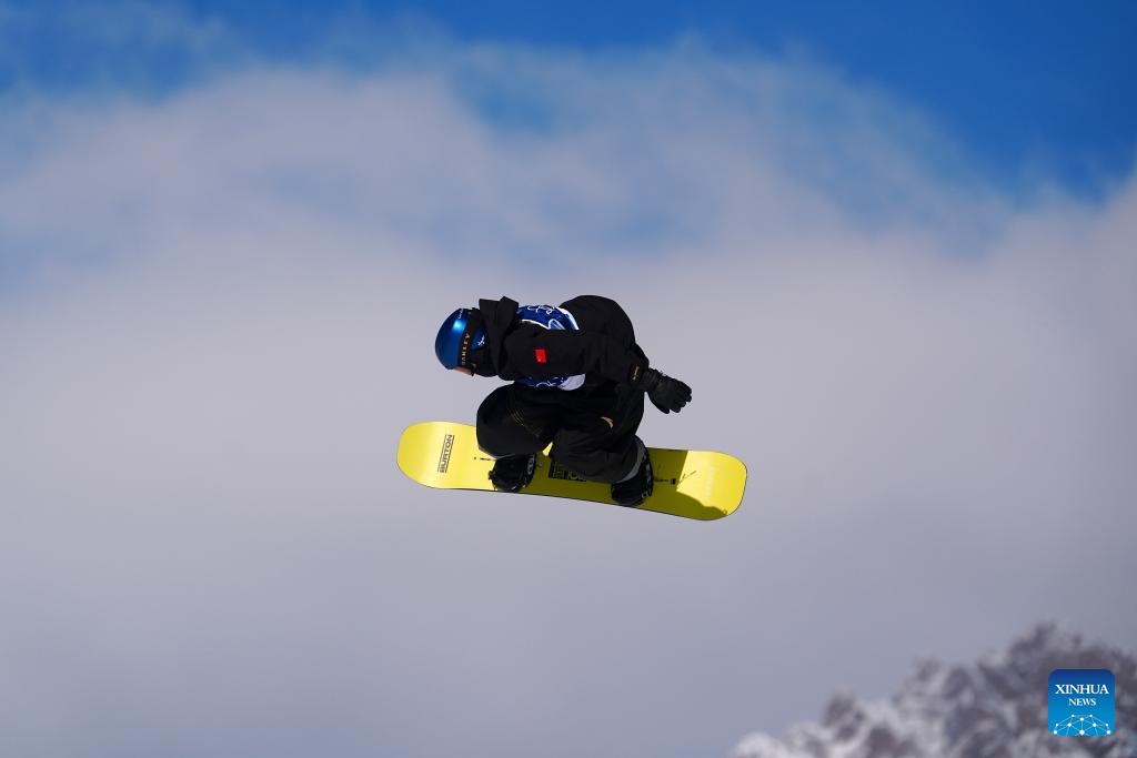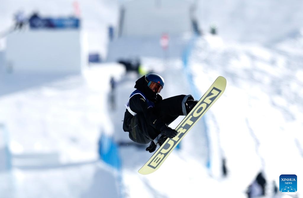 Yang Wenlong of China competes during the snowboard men's snowboard slopestyle qualification at the Milan-Cortina 2026 Olympic Winter Games in Livigno, Italy, Feb. 15, 2026. (Xinhua/Wang Peng)