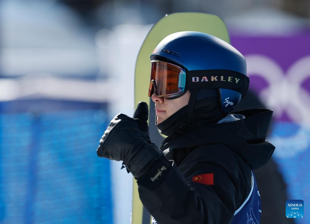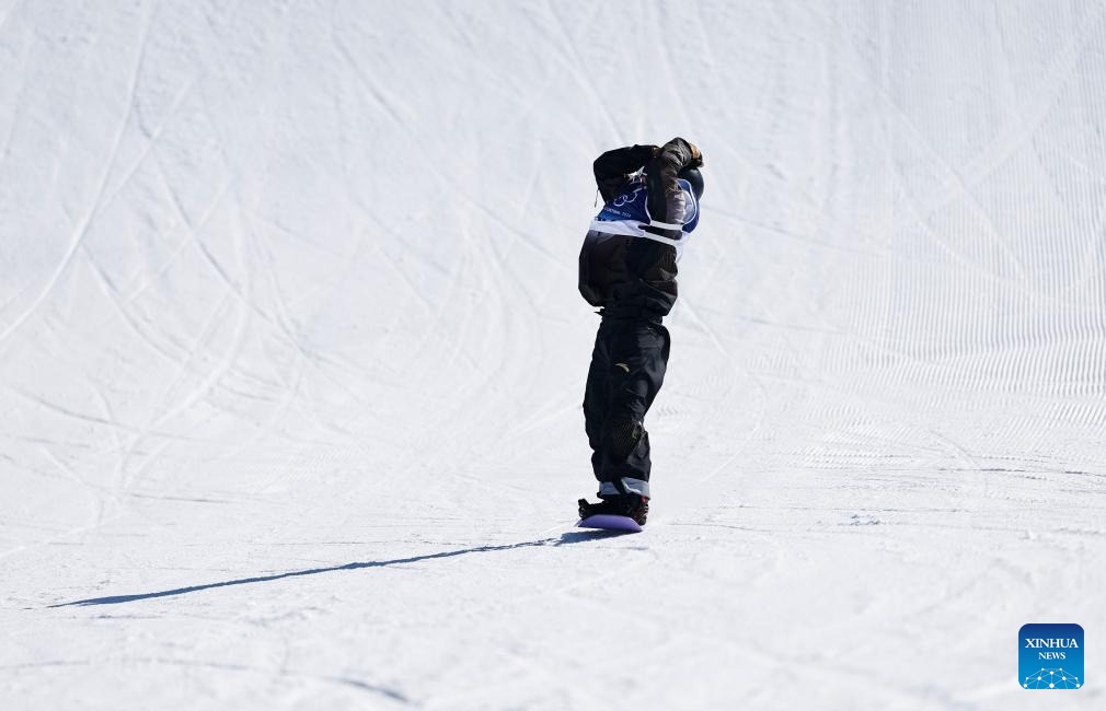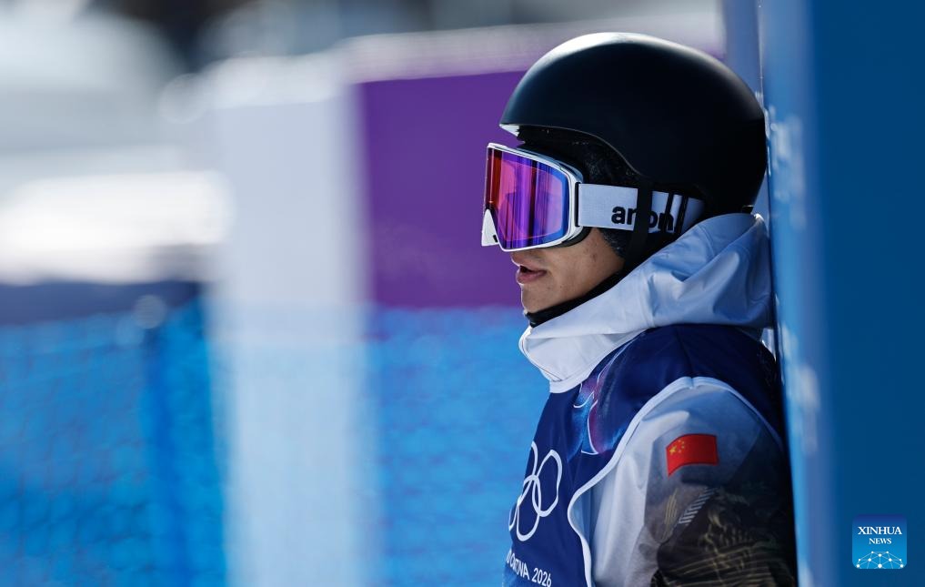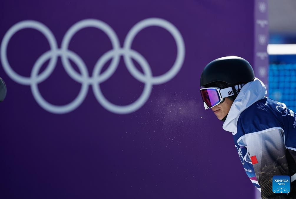 Yang Wenlong of China reacts after competing at the snowboard men's snowboard slopestyle qualification at the Milan-Cortina 2026 Olympic Winter Games in Livigno, Italy, Feb. 15, 2026. (Xinhua/Wang Peng)