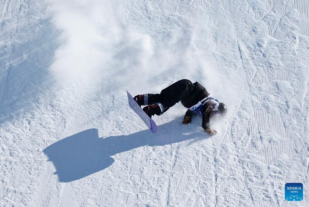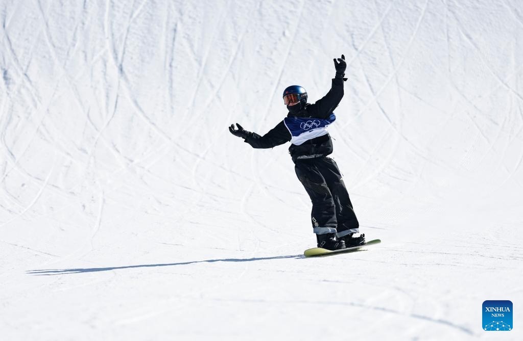 Yang Wenlong of China reacts during the snowboard men's snowboard slopestyle qualification at the Milan-Cortina 2026 Olympic Winter Games in Livigno, Italy, Feb. 15, 2026. (Xinhua/Wang Peng)