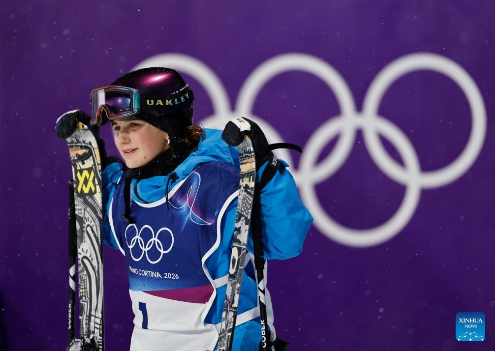 Flora Tabanelli of Italy reacts during the freestyle skiing women's freeski big air final at the Milan-Cortina 2026 Olympic Winter Games in Livigno, Italy, Feb. 16, 2026. (Xinhua/Wang Peng)