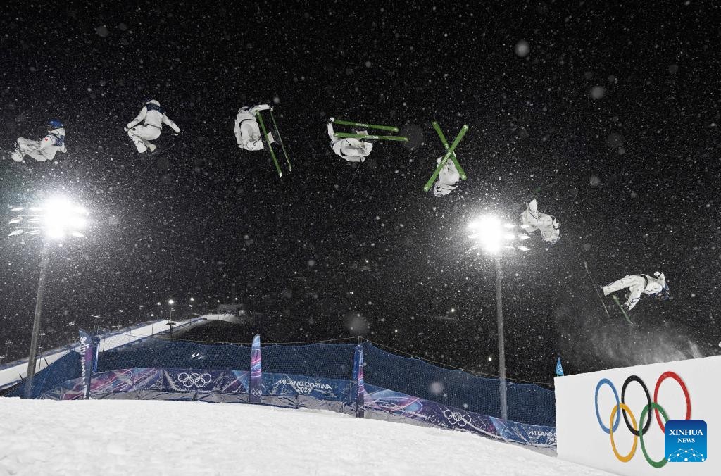 This multi-exposure photo shows Gu Ailing of China competing during the freestyle skiing women's freeski big air final at the Milan-Cortina 2026 Olympic Winter Games in Livigno, Italy, Feb. 16, 2026. (Xinhua/Xia Yifang)