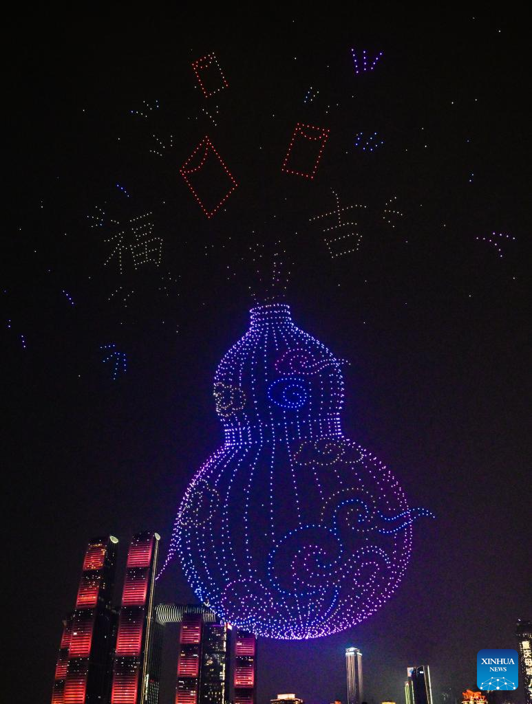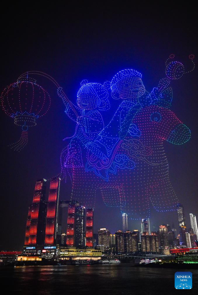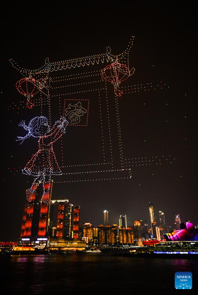 A drone light show themed "Majestic Landscapes, Dynamic Chongqing" is staged in southwest China's Chongqing Municipality, Feb. 17, 2026. (Xinhua/Wang Quanchao)