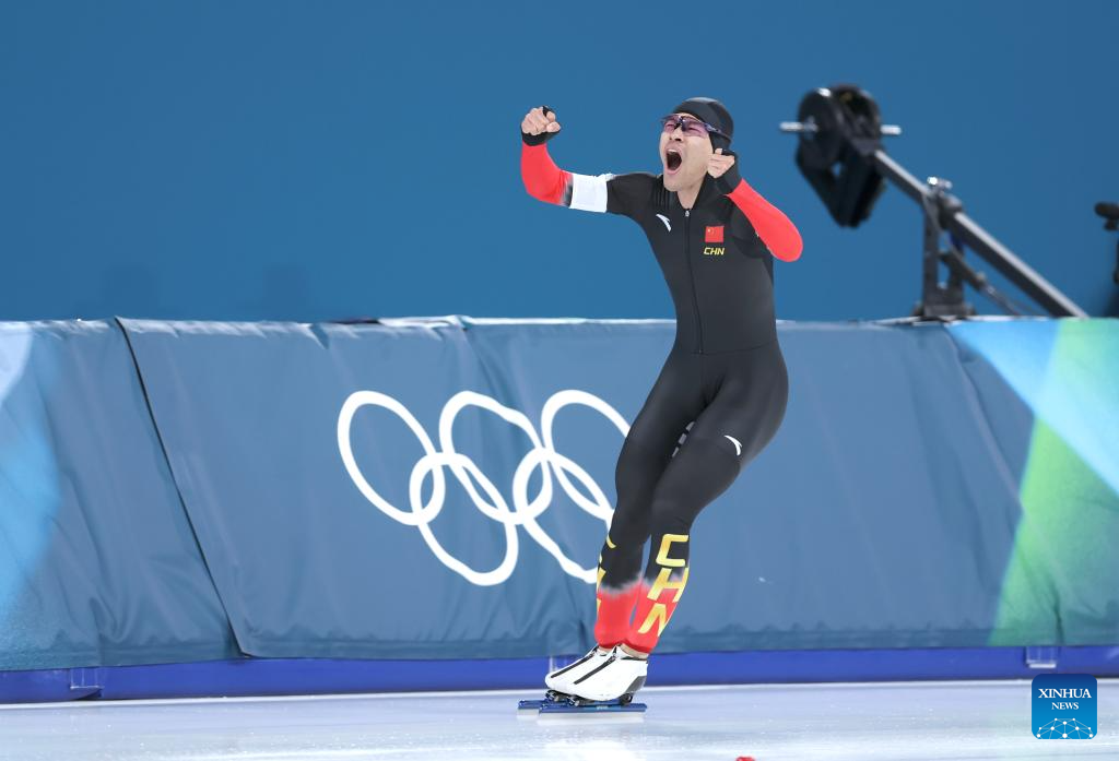 Ning Zhongyan of China celebrates after the speed skating men's 1500m event at the Milan-Cortina 2026 Olympic Winter Games in Milan, Italy, Feb. 19, 2026. (Xinhua/Wu Wei)