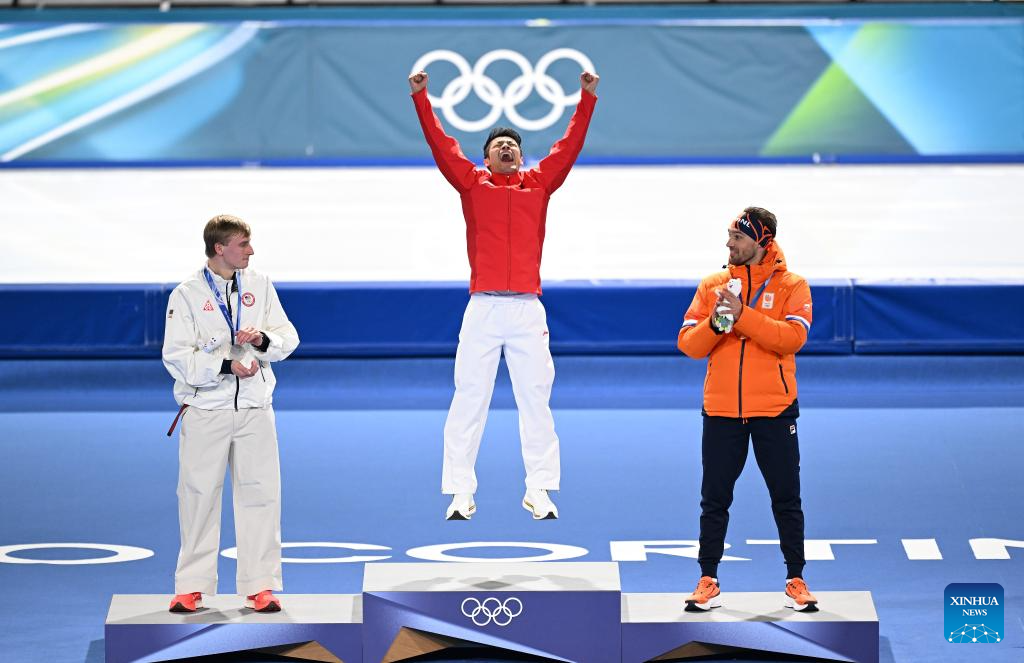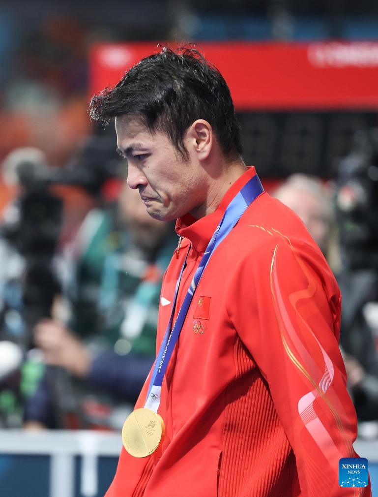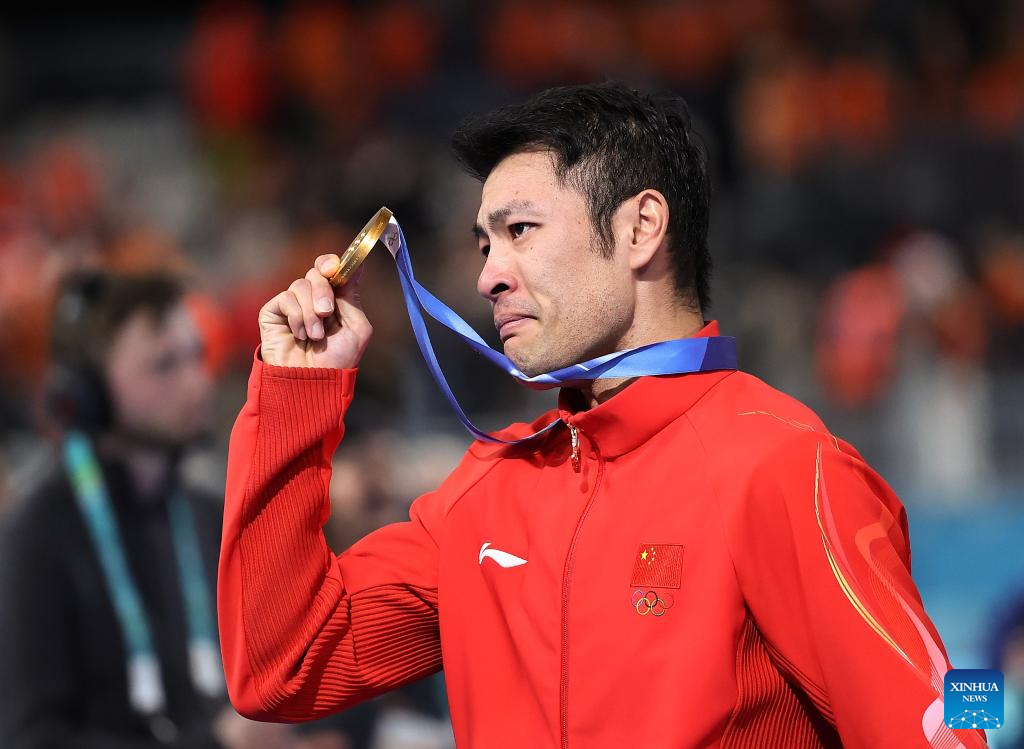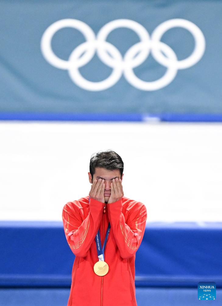 Gold medalist Ning Zhongyan of China reacts during the awarding ceremony of the speed skating men's 1500m event at the Milan-Cortina 2026 Olympic Winter Games in Milan, Italy, Feb. 19, 2026. (Xinhua/Wu Wei)