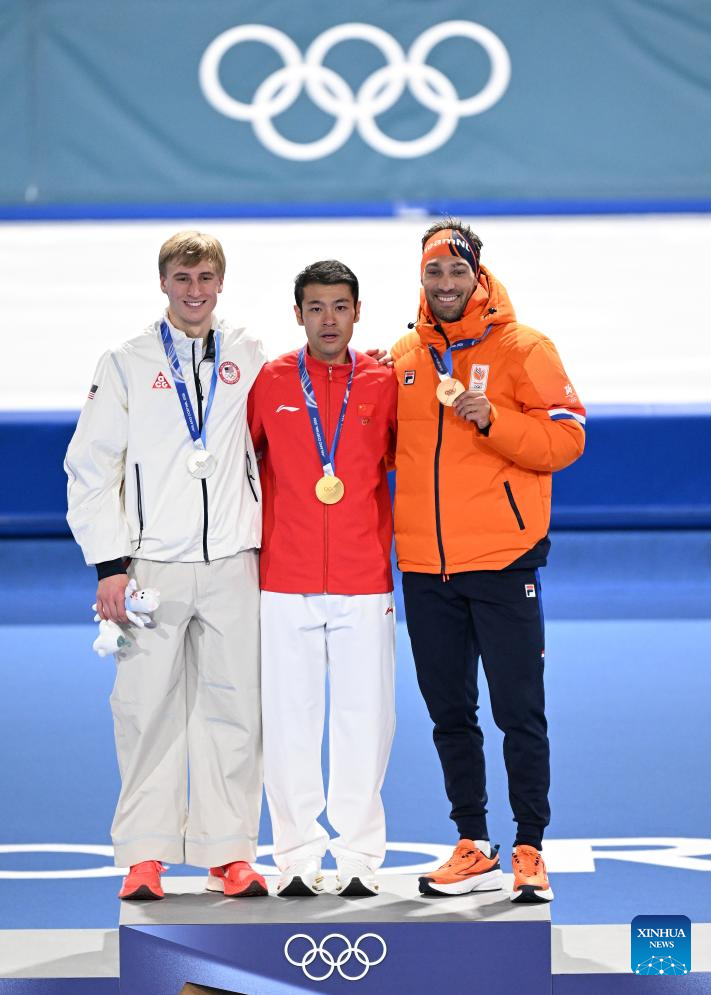 Gold medalist Ning Zhongyan (C) of China, silver medalist Jordan Stolz (L) of the United States and bronze medalist Kjeld Nuis of the Netherlands pose for photos during the awarding ceremony of the speed skating men's 1500m event at the Milan-Cortina 2026 Olympic Winter Games in Milan, Italy, Feb. 19, 2026. (Xinhua/Li Jing)