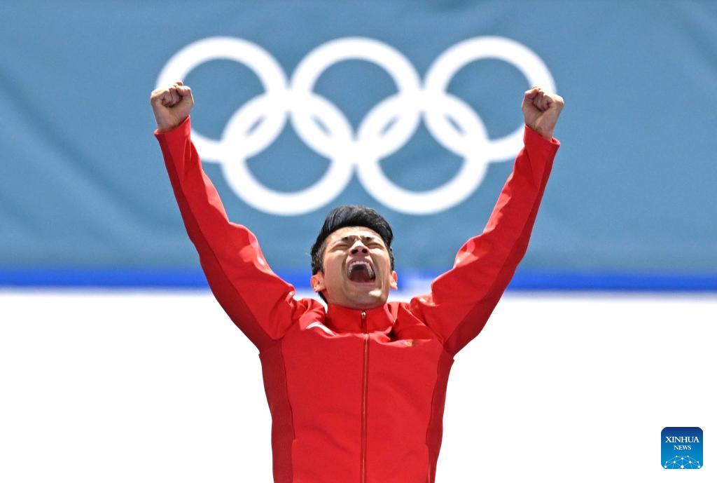 Ning Zhongyan of China celebrates after winning the speed skating men's 1500m event at the Milan-Cortina 2026 Olympic Winter Games in Milan, Italy, Feb. 19, 2026. (Xinhua/Du Xiaoyi)