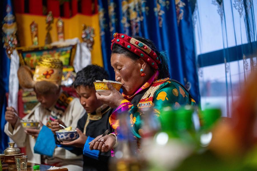 Sangs-rgyas (1st, R) enjoys "gutu," a kind of soup made of flour, with his family at home in Gurum Village of Chamco Township, Dingri County, southwest China's Xizang Autonomous Region, Feb. 16, 2026. "Gu" in Tibetan means nine and "Tu" means pasta. At the Night of Gutu, the whole family and relatives gather to enjoy the dish and celebrate the occasion. (Xinhua/Tenzing Nima Qadhup)