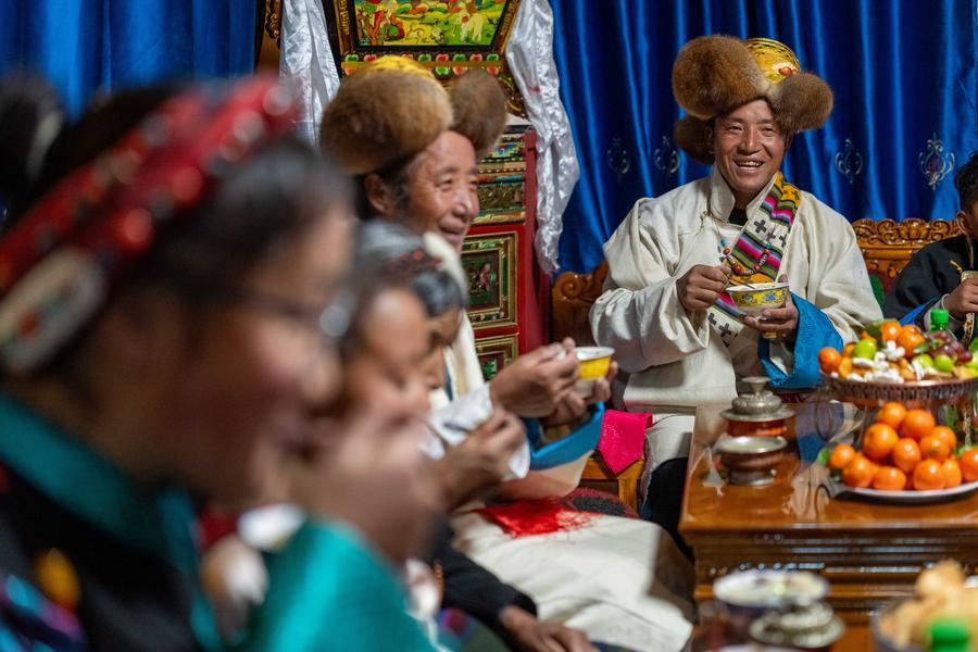 LHASA, Feb. 19 (Xinhua) -- Monday was the Chinese New Year's Eve, which coincided with the Night of Gutu of the Tibetan calendar. Enjoying the festive atmosphere, the family of Sangs-rgyas purchased new furniture and stocked up on New Year goods, celebrating their first Spring Festival and Tibetan New Year after moving into their new house.