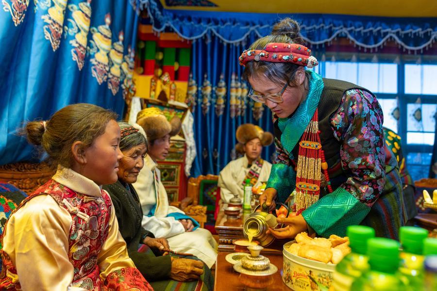 Tenzin Wangmo (1st, R) serves tea for her grandma Tsering Tarchok at home in Gurum Village of Chamco Township, Dingri County, southwest China's Xizang Autonomous Region, Feb. 16, 2026. (Xinhua/Tenzing Nima Qadhup)