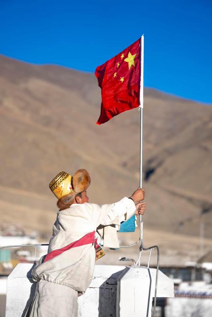 Sangs-rgyas places a Chinese national flag on top of his roof in Gurum Village of Chamco Township, Dingri County, southwest China's Xizang Autonomous Region, Feb. 16, 2026. (Xinhua/Tenzing Nima Qadhup)