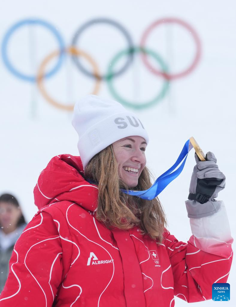Gold medalist Marianne Fatton of Switzerland shows her medal during the awarding ceremony of the ski mountaineering women's sprint event at the Milan-Cortina 2026 Olympic Winter Games in Bormio, Italy, Feb. 19, 2026. (Xinhua/Hu Huhu)