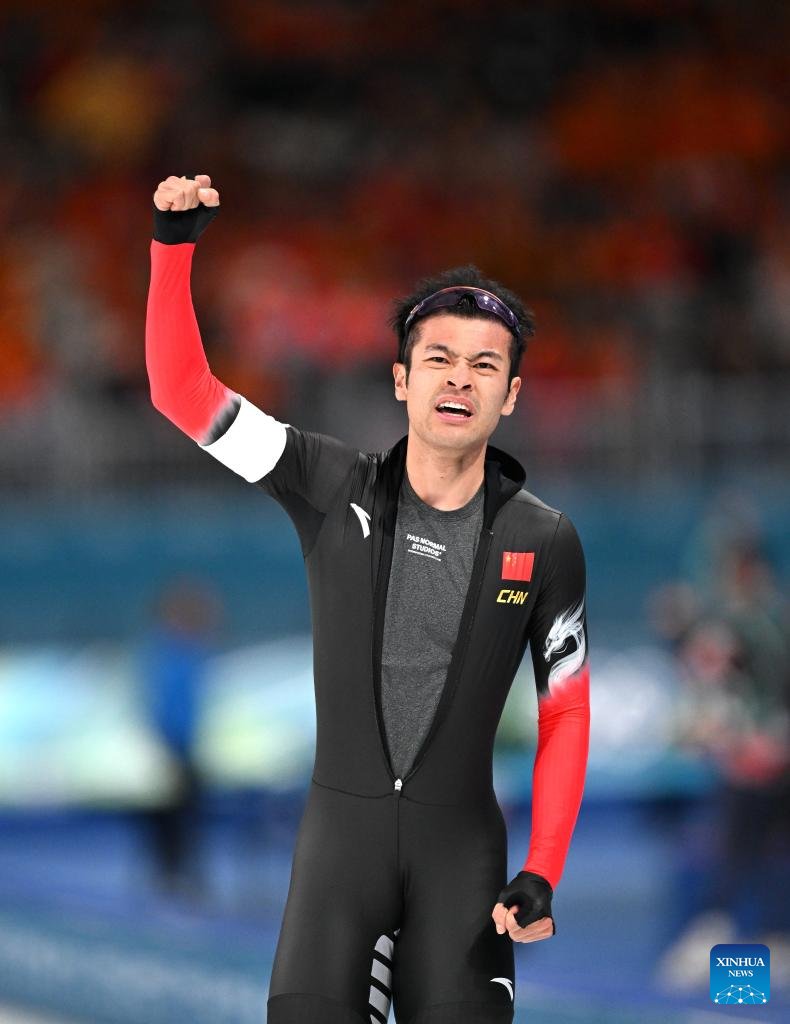 Ning Zhongyan of China celebrates after the speed skating men's 1500m event at the Milan-Cortina 2026 Olympic Winter Games in Milan, Italy, Feb. 19, 2026. (Xinhua/Wu Wei)