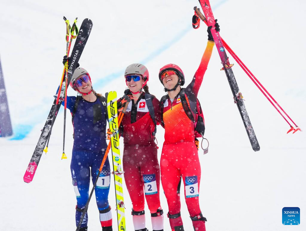 Gold medalist Marianne Fatton (C) of Switzerland, silver medalist Emily Harrop (L) of France, and bronze medalist Ana Alonso Rodriguez of Spain celebrate after the ski mountaineering women's sprint event at the Milan-Cortina 2026 Olympic Winter Games in Bormio, Italy, Feb. 19, 2026. (Xinhua/Yan Linyun)