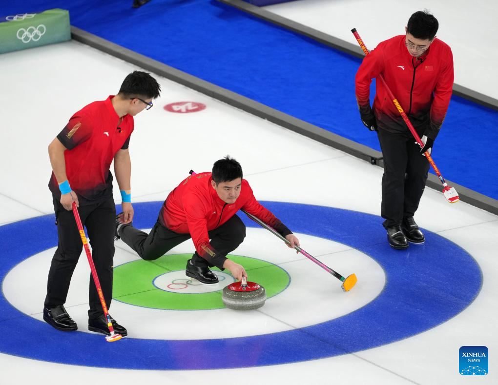 Li Zhichao, Xu Xiaoming and Xu Jingtao (L-R) of China compete during the curling men's round robin session 12 match between China and Germany at the 2026 Milan-Cortina Winter Olympics in Cortina, Italy, Feb. 19, 2026. (Xinhua/Li Gang)