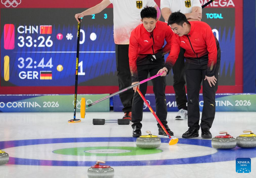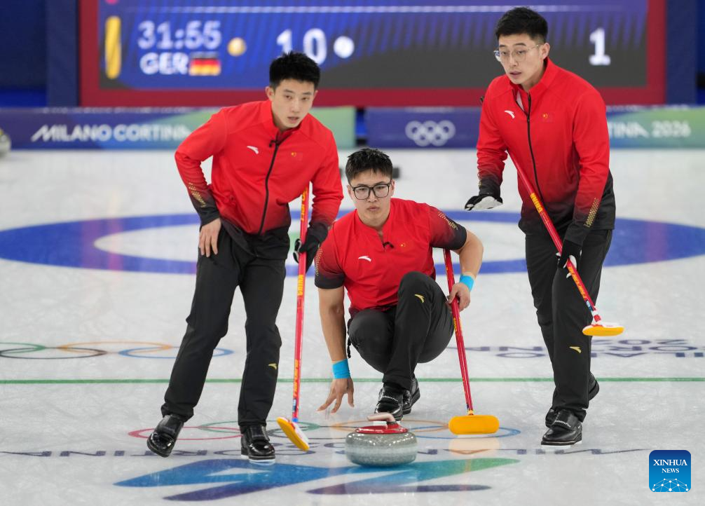 Fei Xueqing (C) of China competes during the curling men's round robin session 12 match between China and Germany at the 2026 Milan-Cortina Winter Olympics in Cortina, Italy, Feb. 19, 2026. (Xinhua/Li Gang)