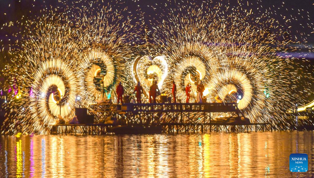 A molten iron fireworks show is staged on water at a botanical garden in Luoyang City, central China's Henan Province, Feb. 17, 2026. During the Spring Festival, lantern decorations across the country created a joyful atmosphere for the holiday. (Photo by Huang Zhengwei/Xinhua)