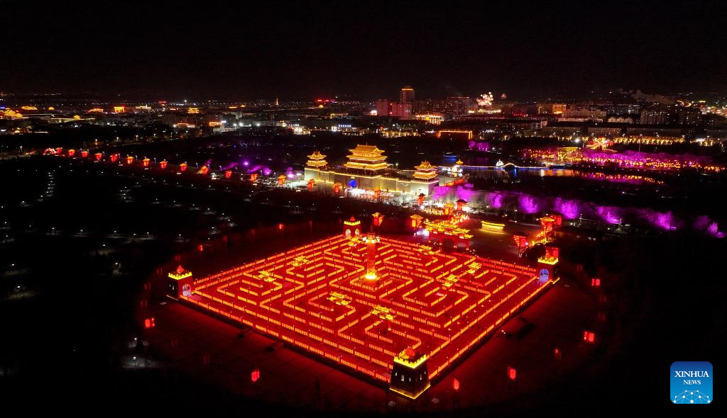 An aerial drone photo taken on Feb. 18, 2026 shows a night view in Yanchi County, northwest China's Ningxia Hui Autonomous Region. During the Spring Festival, lantern decorations across the country created a joyful atmosphere for the holiday. (Xinhua/Feng Kaihua)