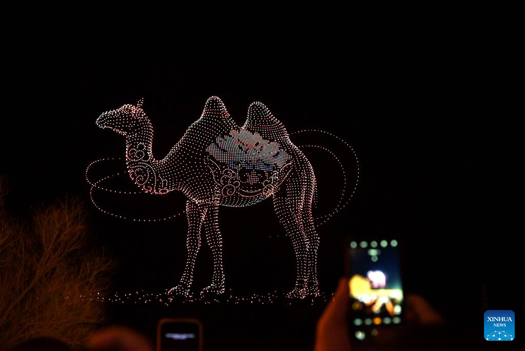 People watch a drone show at a scenic spot in Dunhuang, northwest China's Gansu Province, Feb. 22, 2026. (Photo by Gao Hongshan/Xinhua)