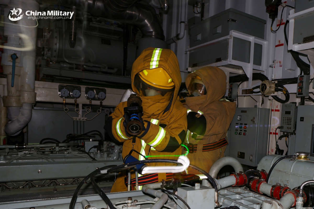 Sailors assigned to a frigate flotilla under the PLA Southern Theater Command conduct damage control drill aboard the corvette Hanzhong (Hull 648) during a maritime training exercise in mid-January, 2026. (eng.chinamil.com.cn/Photo by Zhang bin)