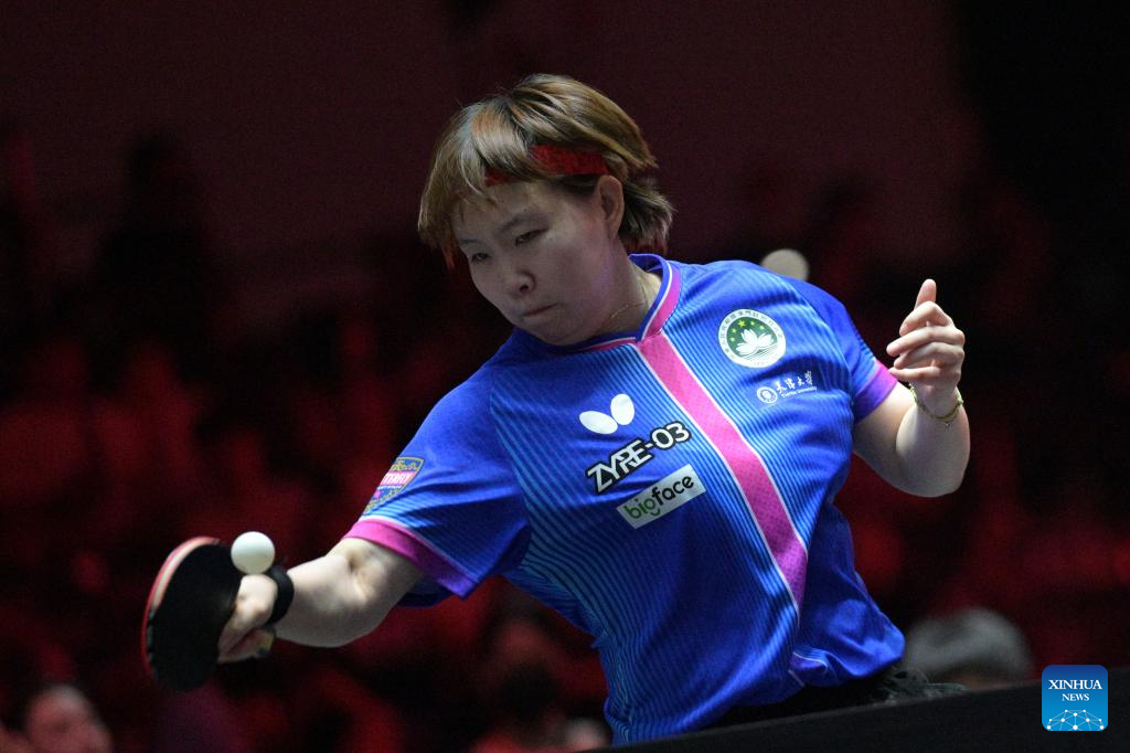 Zhu Yuling of China's Macao hits a return during the women's singles round of 64 match between Manika Batra of India and Zhu Yuling of China's Macao at the World Table Tennis (WTT) Singapore Smash 2026 in Singapore on Feb. 23, 2026. (Photo by Then Chih Wey/Xinhua)