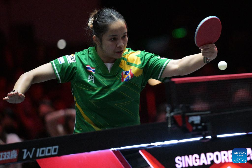 Orawan Paranang of Thailand hits a return during the women's singles round of 64 match between Sun Yingsha of China and Orawan Paranang of Thailand at the World Table Tennis (WTT) Singapore Smash 2026 in Singapore on Feb. 23, 2026. (Photo by Then Chih Wey/Xinhua)