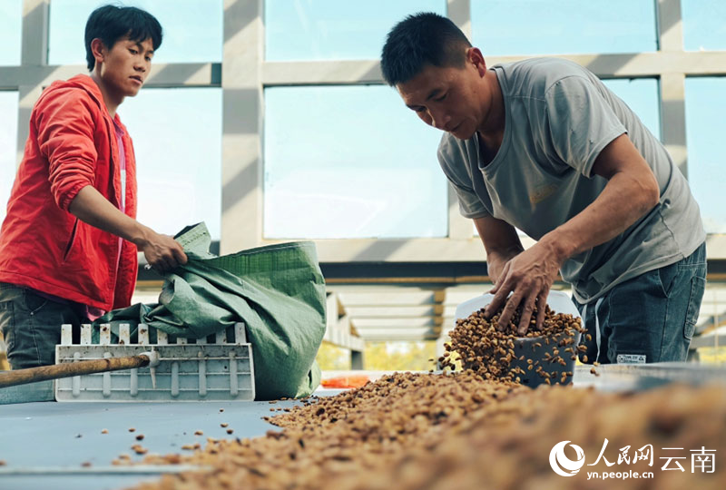 Workers package dried coffee beans at Xigui coffee estate in Xigui village, Bangdong township, Linxiang district, Lincang city, southwest China's Yunnan Province. (People's Daily Online/Yin Xin)