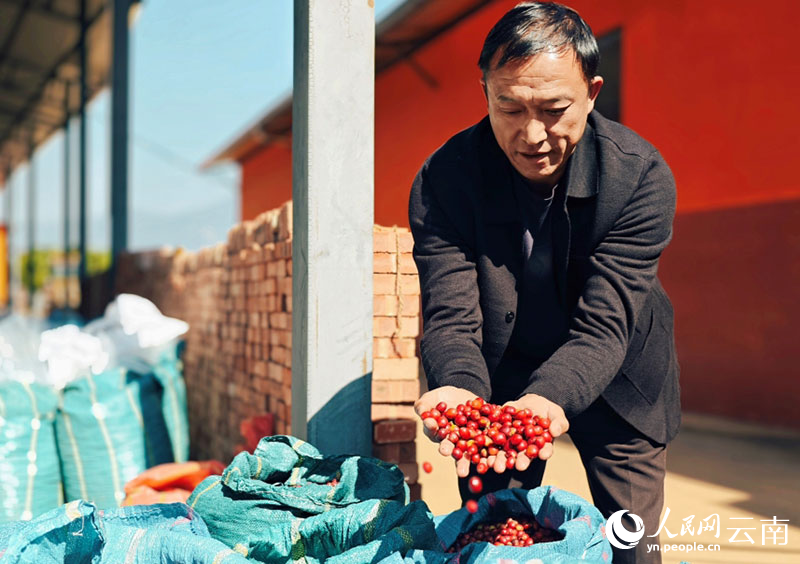 A man showcases fresh coffee cherries in Lincang city, southwest China's Yunnan Province. (People's Daily Online/Yin Xin)
