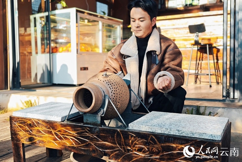 Yang Xiongfei, a barista with six years of experience from Qujing city, arrived last August in Wanyao village, Boshang town, Linxiang district, Lincang, to explore new possibilities in coffee-making. Each day at the newly opened cafe in the village, he slowly roasts coffee beans in traditional clay pots.