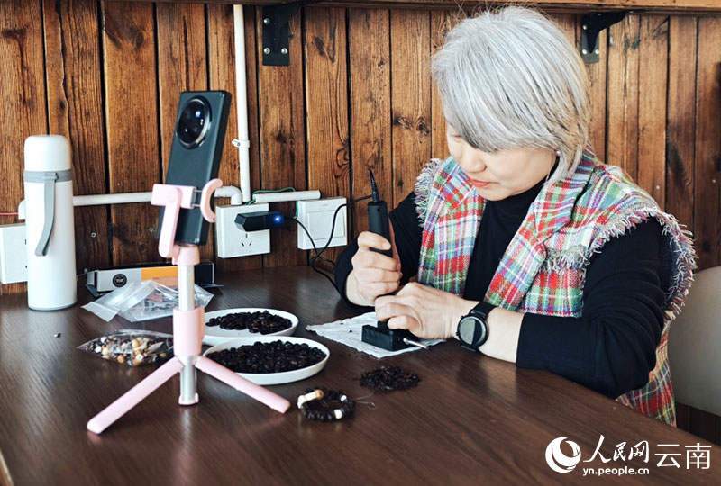 A staff member makes a bracelet with coffee beans during a livestream session at Yunjia coffee estate in Lincang city, southwest China's Yunnan Province. (People's Daily Online/Yin Xin)