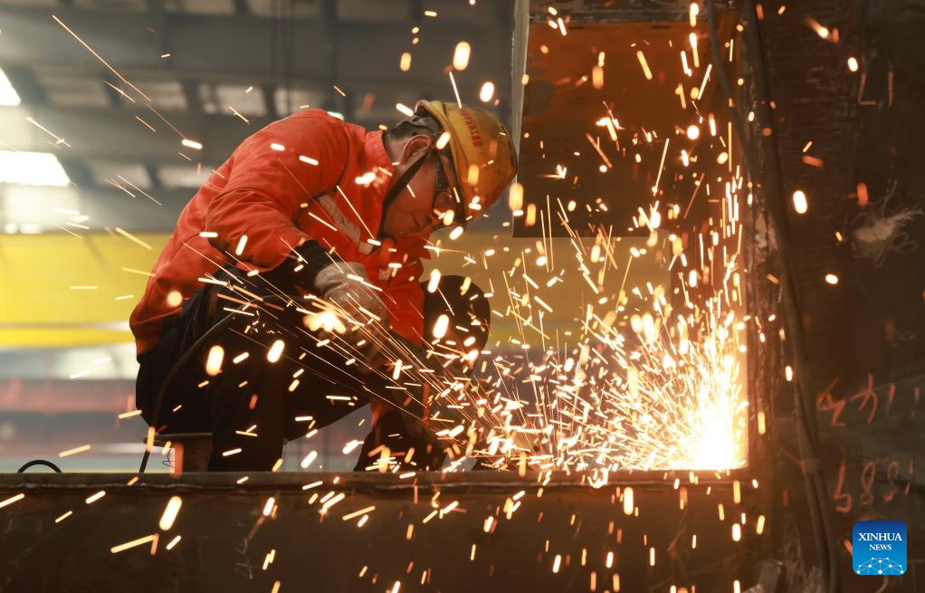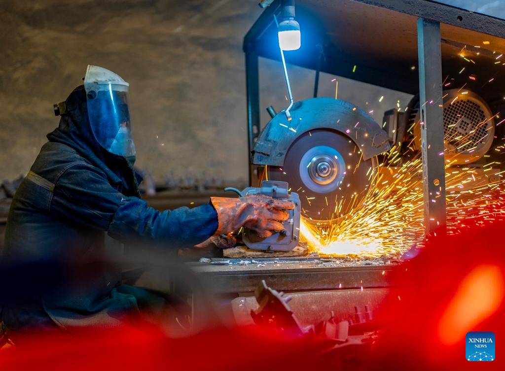 A worker carries out grinding operation at a manufacturing base in Wuhan, central China's Hubei Province, Feb. 25, 2026. As production resumes after the Spring Festival holiday, factories and enterprises across the country are operating at full steam to meet orders and ramp up output. (Photo by Zhao Jun/Xinhua)