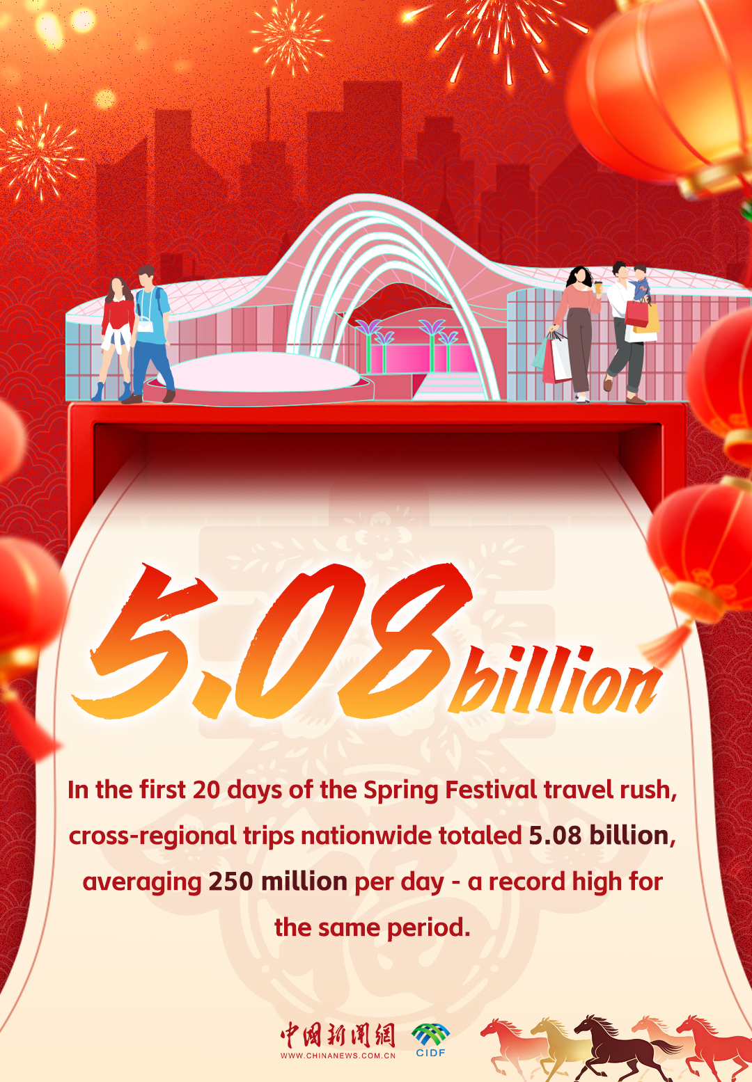 The 2026 Spring Festival travel rush, known as chunyun and often described as the world's largest human migration, is expected to generate a record 9.5 billion inter-regional passenger trips during the 40-day period running from Feb. 2 to March 13. As of Saturday, the travel rush had passed its halfway mark, with 5.08 billion inter-regional trips completed in the first 20 days.