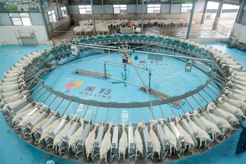 In the smart production workshop of Shaanxi Hongxing Meiling Dairy Co., Ltd., rotary milking systems run automatically, data on the goats' health conditions is displayed in real time, and finished goat milk powder is packaged efficiently before being shipped nationwide.