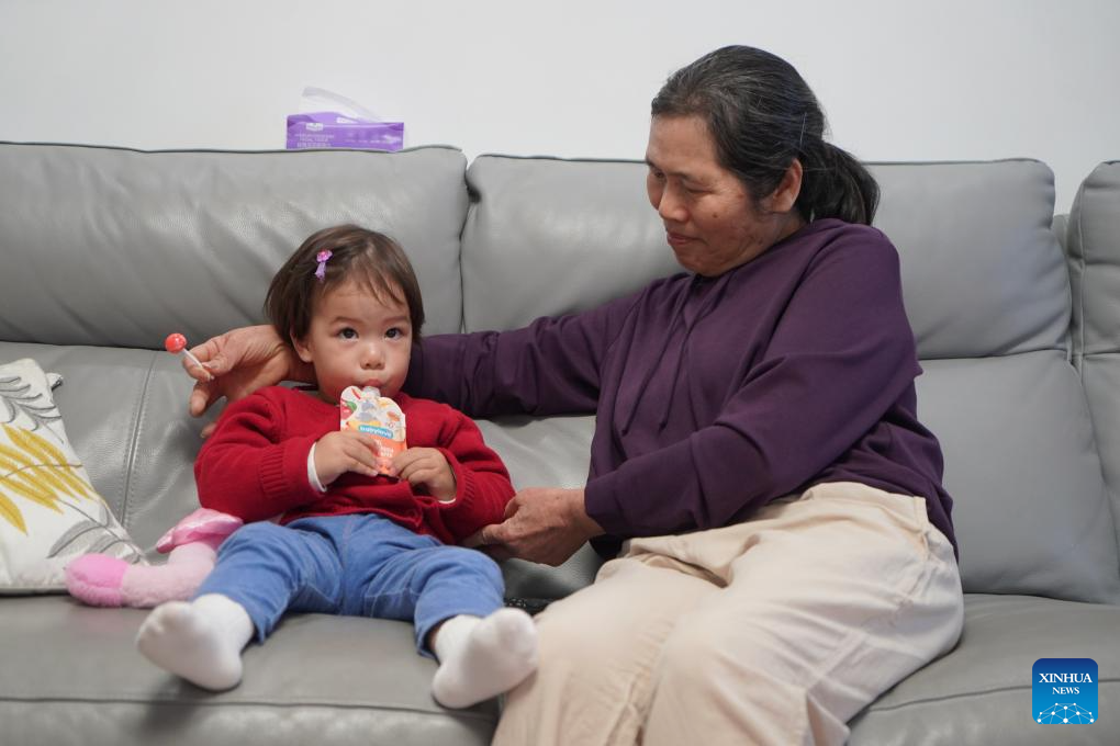 Jiang Xiaohua's mother (R) takes care of her granddaughter at home in Taicang, east China's Jiangsu Province, on Feb. 26, 2026. (Photo by Liu Zhenrui/Xinhua)