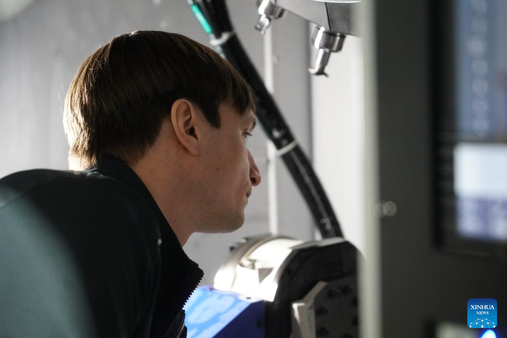 Christopher Praetzas prepares for a noise test on the central air supply system in a semi-anechoic chamber of CIT (Taicang) Automotive Technology Co., Ltd. in Taicang, east China's Jiangsu Province, on Feb. 25, 2026. (Photo by Liu Zhenrui/Xinhua)