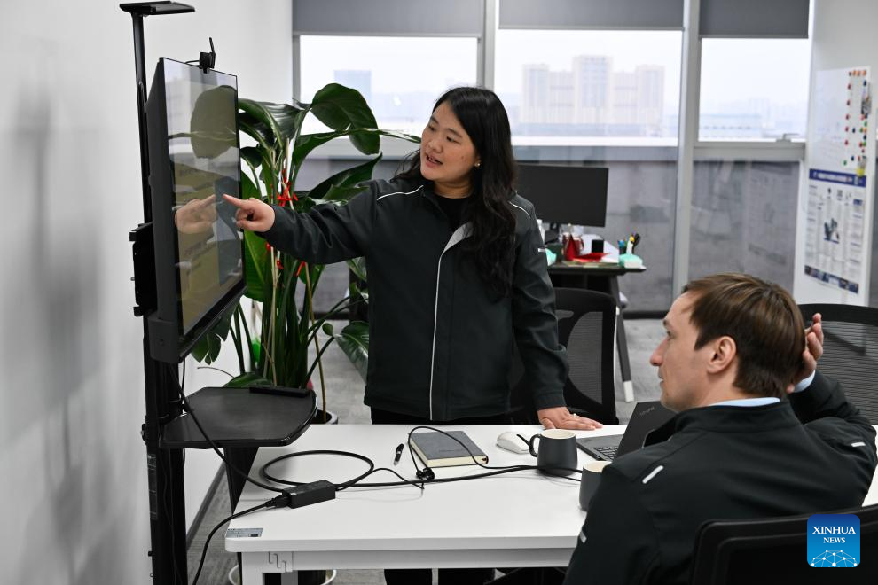 Christopher Praetzas (front) and Jiang Xiaohua discuss customer demands at their office in CIT (Taicang) Automotive Technology Co., Ltd., in Taicang, east China's Jiangsu Province, on Feb. 25, 2026. (Xinhua/Ji Chunpeng)