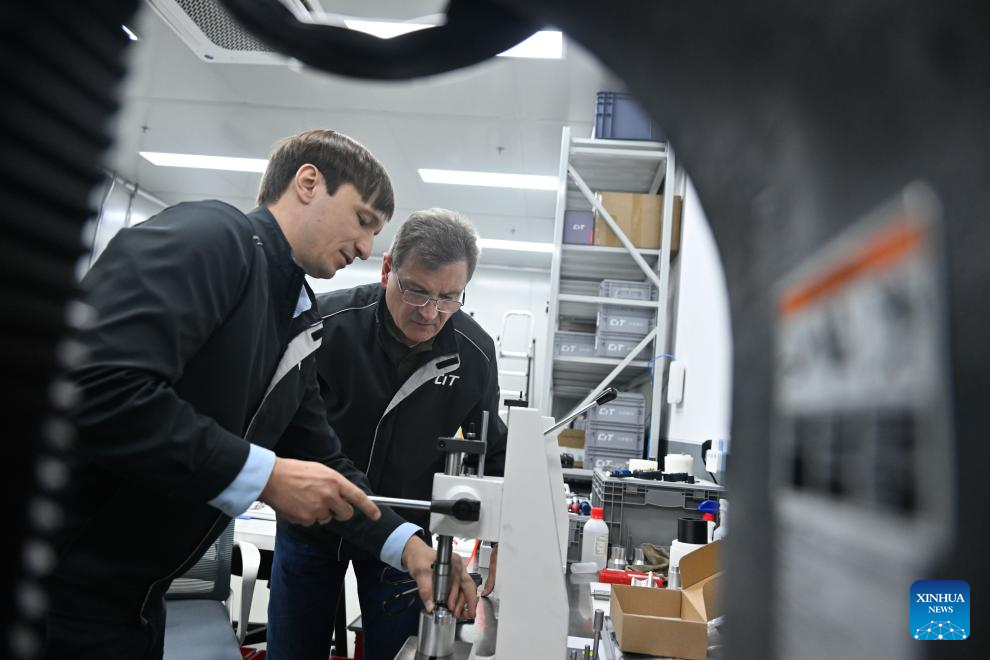 Christopher Praetzas (L) and production director of the company assemble samples at a workshop of CIT (Taicang) Automotive Technology Co., Ltd. in Taicang, east China's Jiangsu Province, on Feb. 25, 2026. (Xinhua/Ji Chunpeng)