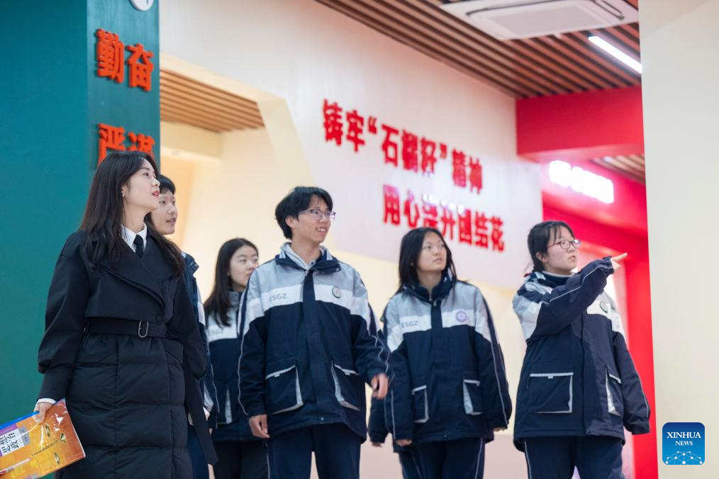 Zhang Qiongli (1st L) and students visit an exhibition hall dedicated to strengthening the awareness of the Chinese national community at Enshi Tujia and Miao Autonomous Prefecture Senior High School in Enshi, central China's Hubei Province, Feb. 4, 2026. (Xinhua/Wu Zhizun)