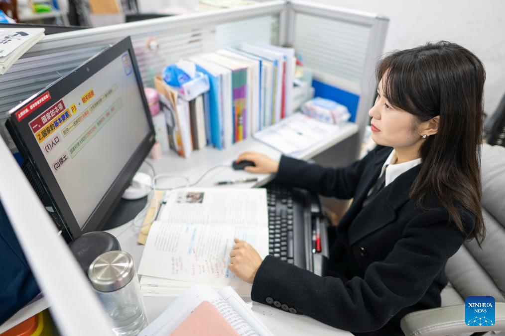 Zhang Qiongli works at her office at Enshi Tujia and Miao Autonomous Prefecture Senior High School in Enshi, central China's Hubei Province, Feb. 3, 2026. (Xinhua/Wu Zhizun)