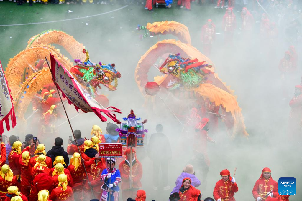 Local people perform dragon dance during the "Maolong Festival" of Yilao ethnic group in Shiqian County, southwest China's Guizhou Province, Feb. 27, 2026. The Maolong Festival, a folk activity for people of the Yilao ethnic group to mark the Spring Festival and the lantern festival, was listed as a national intangible cultural heritage in 2006. The centerpiece of this festival is the Maolong, or "hairy dragon," found only in Shiqian. (Xinhua/Yang Wenbin)
