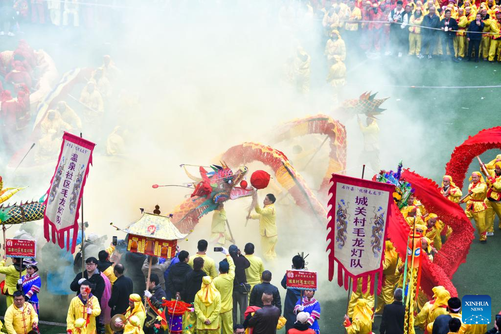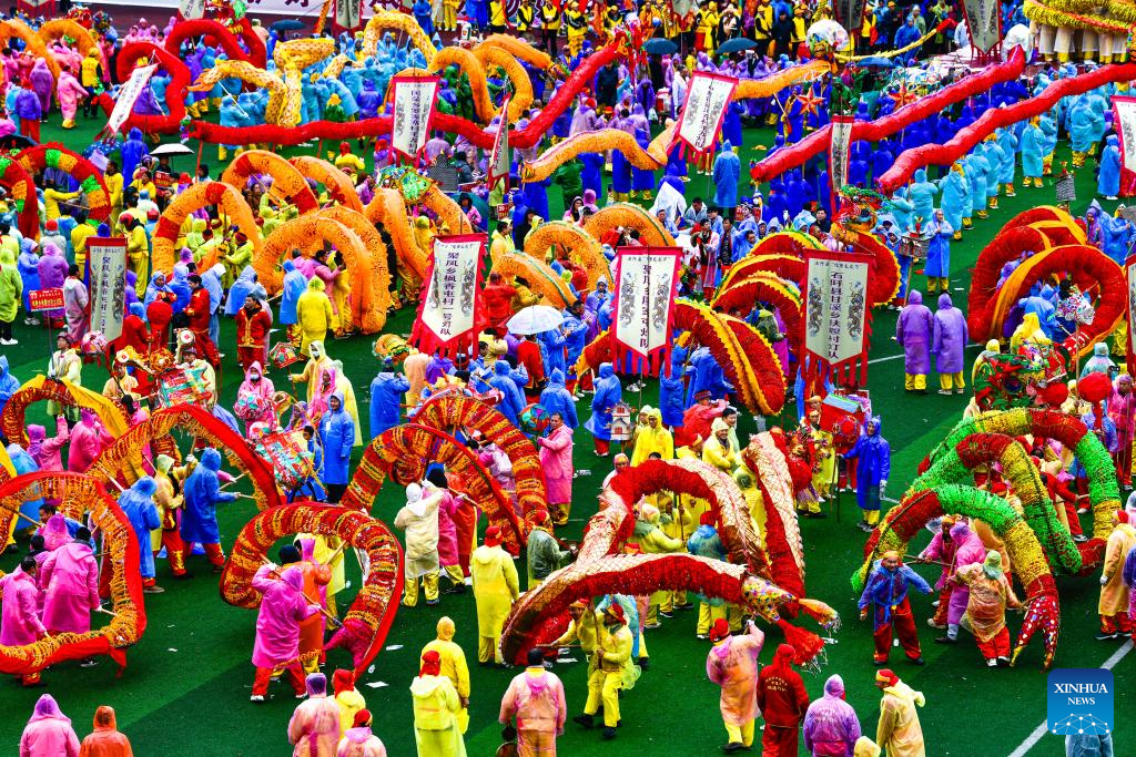 This aerial drone photo shows the opening ceremony of the "Maolong Festival" of Yilao ethnic group in Shiqian County, southwest China's Guizhou Province, Feb. 27, 2026. The Maolong Festival, a folk activity for people of the Yilao ethnic group to mark the Spring Festival and the lantern festival, was listed as a national intangible cultural heritage in 2006. The centerpiece of this festival is the Maolong, or "hairy dragon," found only in Shiqian. (Xinhua/Yang Wenbin)