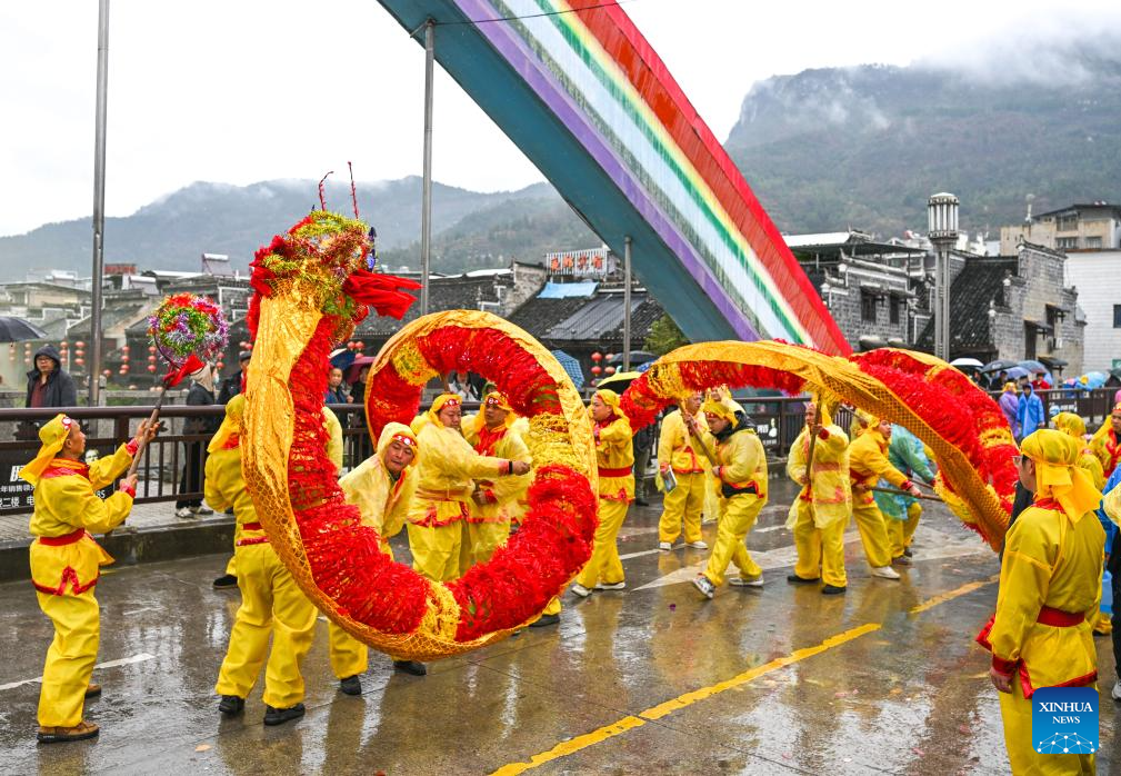 People attend a parade during the "Maolong Festival" of Yilao ethnic group in Shiqian County, southwest China's Guizhou Province, Feb. 27, 2026. The Maolong Festival, a folk activity for people of the Yilao ethnic group to mark the Spring Festival and the lantern festival, was listed as a national intangible cultural heritage in 2006. The centerpiece of this festival is the Maolong, or "hairy dragon," found only in Shiqian. (Xinhua/Yang Wenbin)