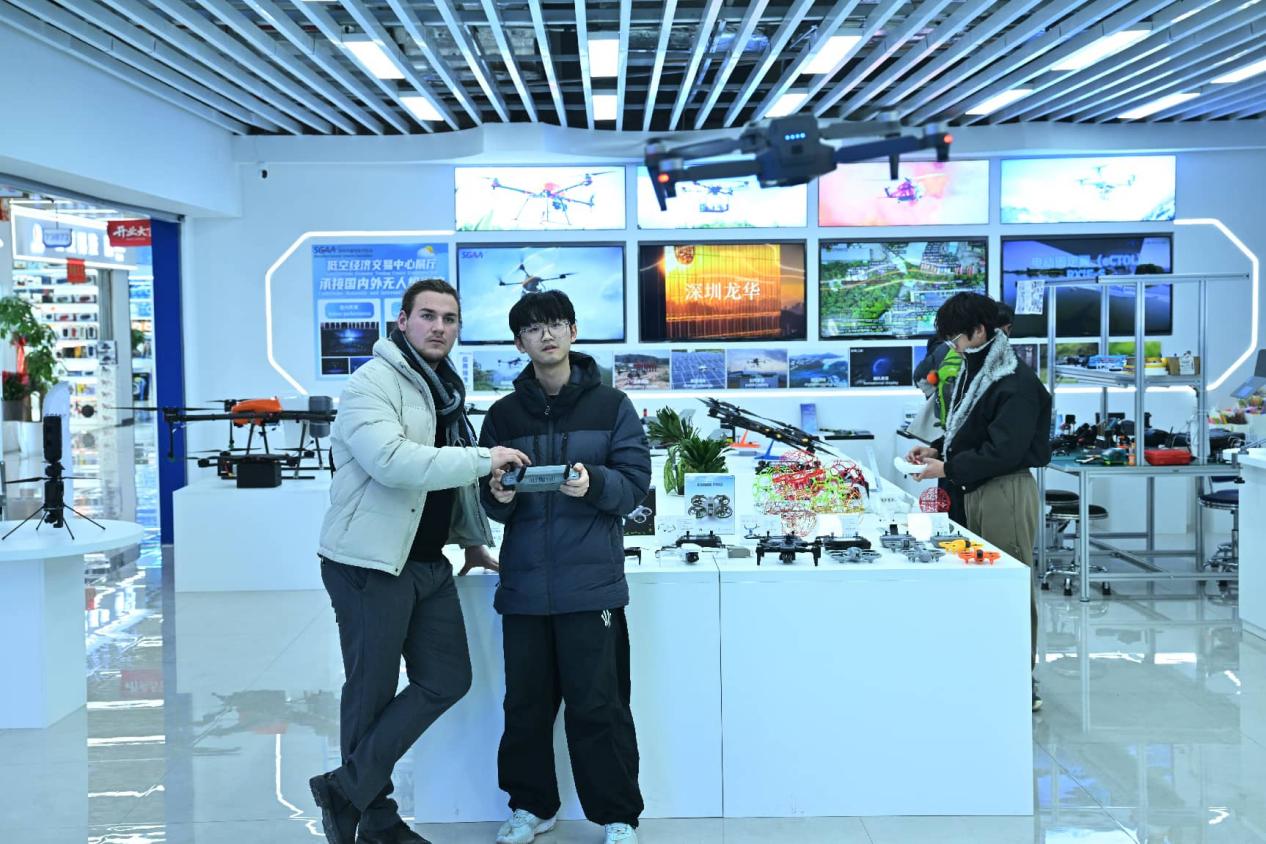 A foreign merchant examines drones at the Yiwu Global Digital Trade Center, east China's Zhejiang province. (Photo/Lyu Bin)