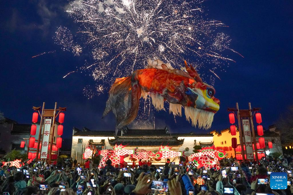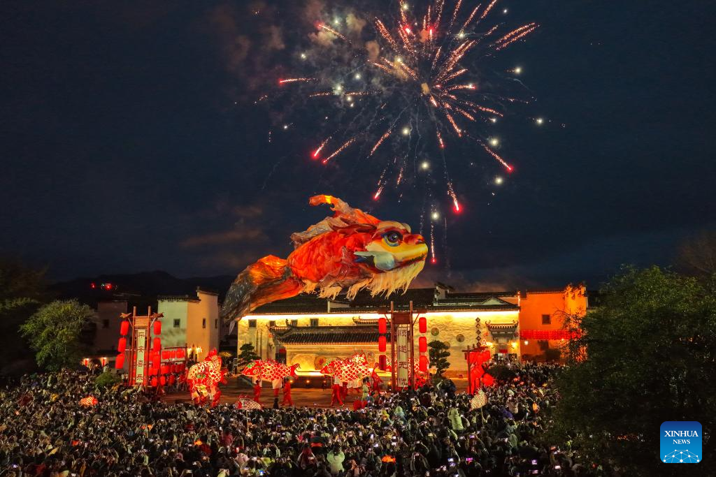 People watch an Ao Fish lantern parade at the Tangmo ancient town in Huangshan City, east China's Anhui Province, Feb. 27, 2026. The lantern parade was held here in celebration of the upcoming Lantern Festival on Friday, featuring the Ao Fish, a mythical Chinese creature with a dragon's head and a fish's body. (Xinhua/Du Yu)