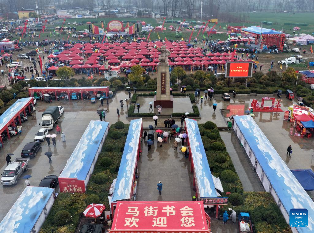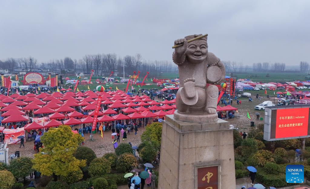An aerial drone photo shows a view at the Majie Quyi Fair at Majie Village of Baofeng County, central China's Henan Province, March 1, 2026.