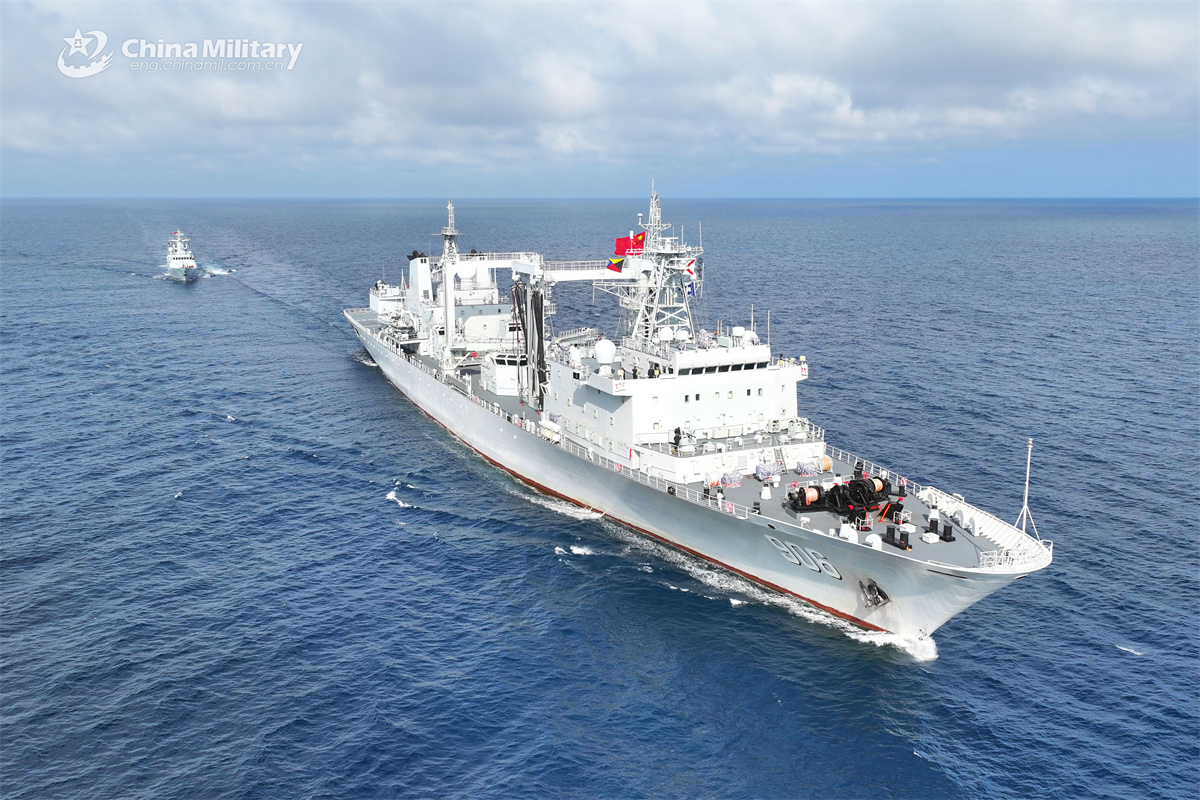 The guided-missile frigate Tongling (Hull 629) attached to a frigate flotilla with the navy under the Chinese PLA Southern Theater Command practices astern replenishment-at-sea with the comprehensive supply ship Honghu (Hull 906) during a maritime assessment in early February, 2026. (eng.chinamil.com.cn/Photo by Zhang Bin)
